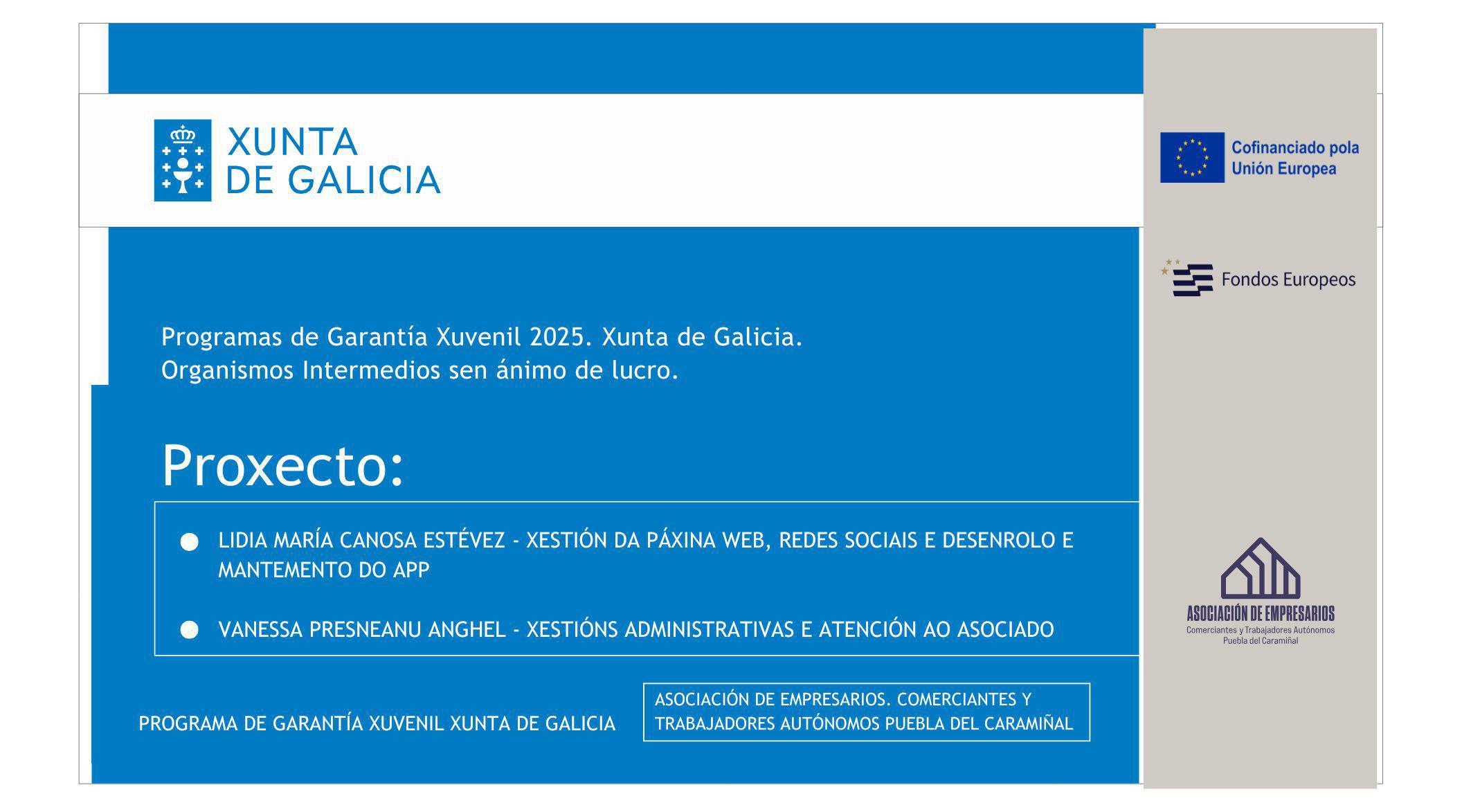 A Asociación de Empresarios, Comerciantes e Traballadores Autónomos da Pobra do Caramiñal continúa reforzando o seu compromiso co emprego xuvenil e coa modernización das súas estruturas. Grazas ao Programa de Garantía Xuvenil 2025 da Xunta de Galicia, cofinanciado pola Unión Europea, a entidade vén de incorporar a dúas novas profesionais que aportarán talento e apoio en áreas clave da asociación.